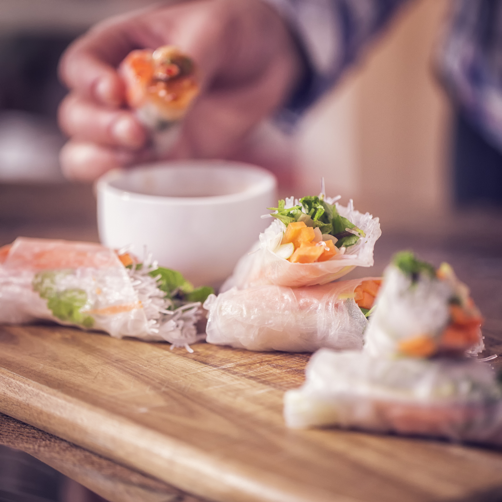 Packed with vibrant veggies, these rainbow spring rolls are a fresh and delicious bite.
