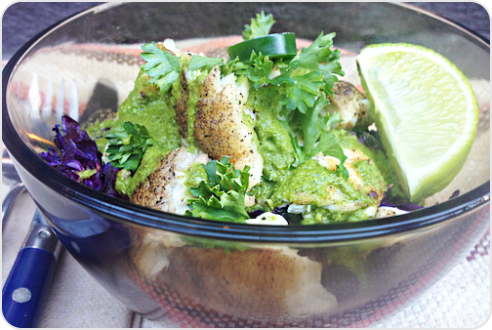 3. Arrange quinoa, black beans, and shredded cabbage in a bowl. Top with fish and spicy sauce. Garnish with lime, parsley, and plain non-fat yogurt as sour cream, if desired.