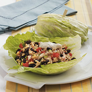 - Prepare rice according to package directions. Place rice in a large bowl. Stir in chicken and next 3 ingredients. Spoon chicken mixture evenly in center of lettuce leaves. Fold in edges of leaves; roll up, and secure with wooden picks. Serve with Spicy Chipotle Dipping Sauce.